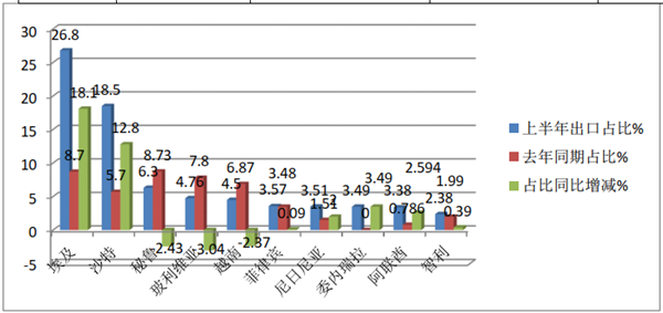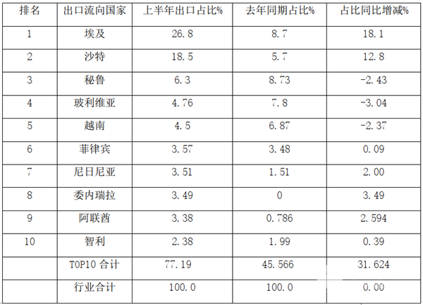3、 TOP10中,市场份额同比7增3降,其中份额同比增长最多的是埃及,增加了18.1个百分点,其次是沙特,份额同比增加12.8个百分点;份额同比减少最多的玻利维亚、其次是秘鲁,再次是越南。