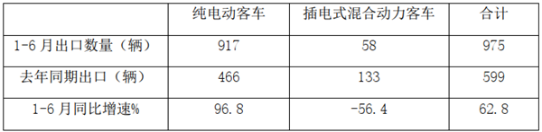 1-6月,纯电动客车累计出口917辆,同比增长96.8%,增长近1倍,是我国上半年客车出口市场中一道靓丽的风景,也是上半年我国客车出口市场唯一的亮点;插电式混合动力客车出口为58辆,同比增长-56.4%;上半年新能源客车累计合计出口975辆,累计同比增长62.8%,比1-5月累计增幅扩大了近13个百分点。