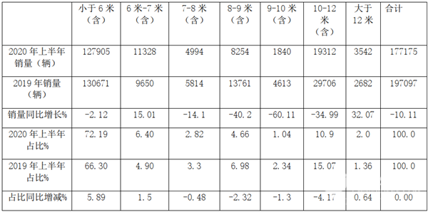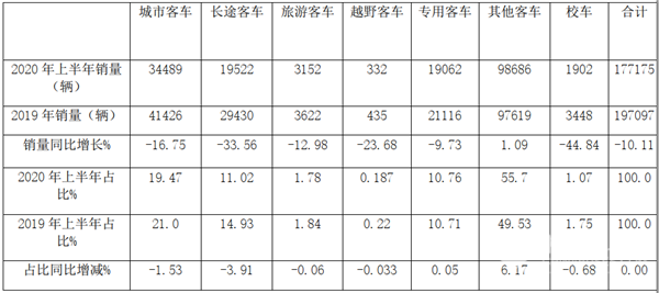 根据中汽协数据,2020年上半年客车累计销售177175辆(不含非完整车辆),同比2019年上半年的197097辆(不含非完整车辆)下降10.11%,现对2020年上半年客车各细分市场销售进行盘点,旨在给客车企业在下一步策划产品方面提供宏观上的参考依据!具体盘点如下: