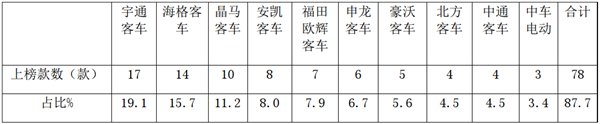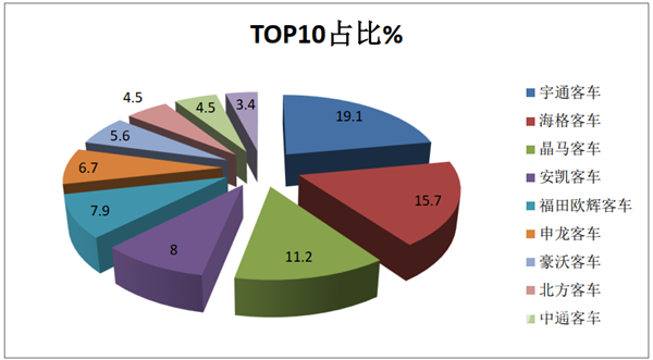 TOP10上榜车型累计占比近9成(87.7%),可见公路客车市场中的垄断程度较高。
