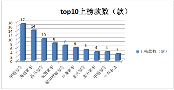 本批次上榜的达标客车车型共由18个车企提供,其中TOP10车企上榜数量: