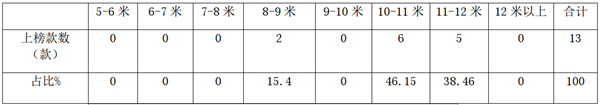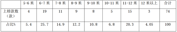 特点四、本批次传统公路客车上榜的达标的74款道路运输客车车型中,6-7米车型最多,占比超四分之一;其次11-12米车型,占比超2成;再次是7-8米,占比近15%