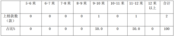 特点六、本批次上榜的2款燃料电池公路客车车型中,9-10米段和11-12米段各1款,占据均为5成