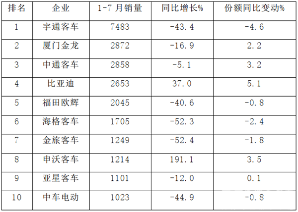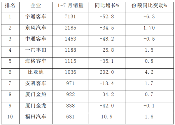在2020年1-7月大型客TOP10中