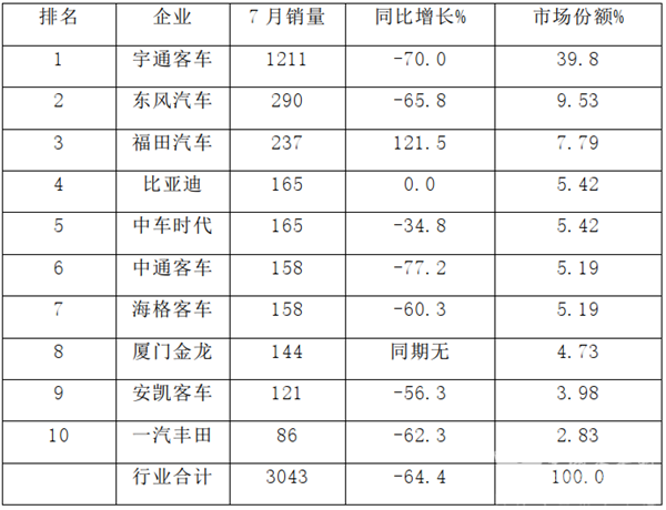 (一)2020年7月中型客车榜单——宇通第一,东风汽车第二,福田第三;TOP10中,销量同比2增1平7降,其中福田汽车同比增长1.21倍