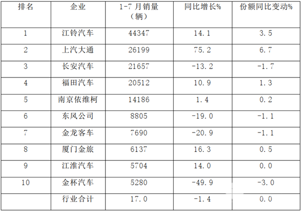 从1-7月轻型客车累计销量看,2020年1-7月,轻型客车市场累计销售17万辆,同比累计下降1.4%,累计销量降幅较前6月(-4%)收缩2.6个百分点。具体到1-7月份销量前十企业看: