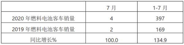 根据中汽协数据,2020年7月,燃料电池客车销量4辆,同比(2019年燃料电池客车为2辆)增长为100%,1-7月燃料电池客车销量为397辆,同比(2019年1-7月燃料电池客车销量为169辆)增长134.9%(表2)。
