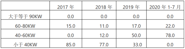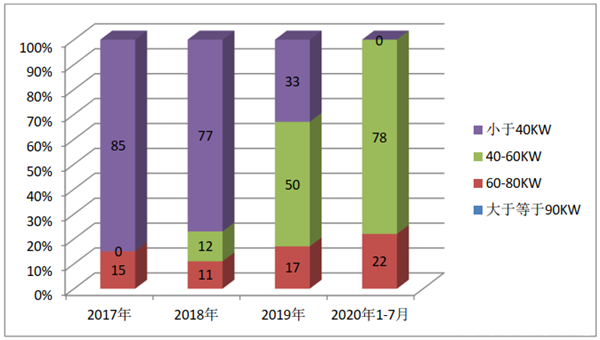 2017年—2020年前7月燃料电池客车系统额定功率结构: