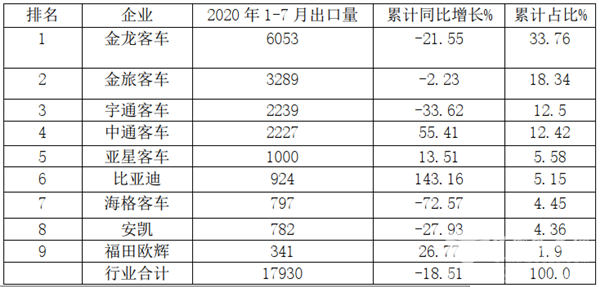 根据中国客车统计信息网统计的29家客车出口数据,2020年7月客车出口TOP9企业