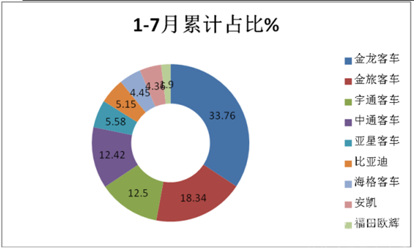 特点四、从7月我国客车企业出口数量看,金龙位居老大,出口数量占比超半壁江山,可谓一家独大;比亚迪居第二,宇通位居第三,中通位居第四,海格位居第五;TOP9中同比2增7降,少家欢喜多家愁;其中安凯客车同比增幅70.8%,增长势头最猛