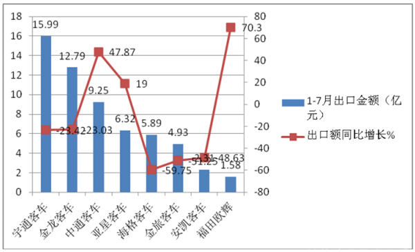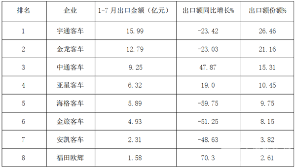 根据中国客车统计信息网数据,2020年1-7月主流大中型客车企业出口金额统计(不含比亚迪):