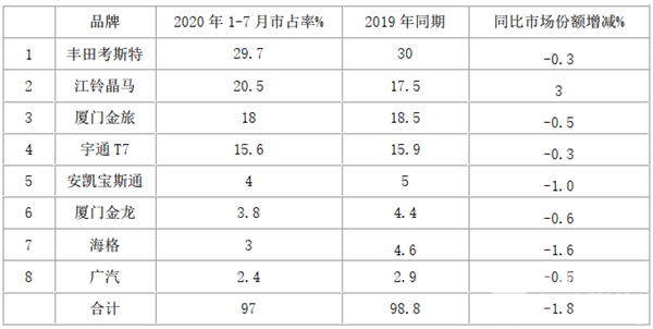据数据统计,前8名考斯特客车品牌销量份额及同比: