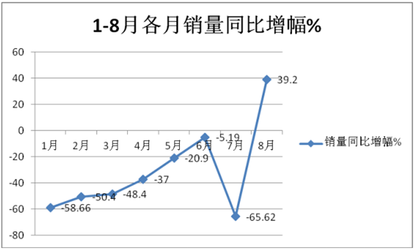 可见,在2020年1-8月各月中,新能源客车销量同比降幅从1月的58.66%依次逐月收窄到6月的5.19%,而到7月曲线突然出现拐点掉头向下,并进入最低点,说明7月同比降幅较大,前6月新能源客车销量同比降幅逐渐收缩的态势在7月不但没有延续,反而一下进入低谷,而到了8月,曲线突然掉头向上,从波谷冲向波峰,达到2020年1-8月各月的最高点,也就是说,8月销量同比增幅最大,而且是唯一同比正增长的月份。