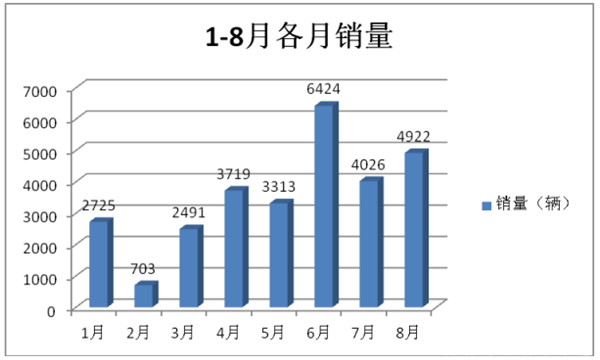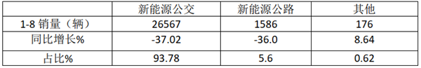 1-8月新能源公路客车市场同比下降36%,小于新能源科学和整体市场降幅近0.8个百分点,且占比只有5.6%,对新能源客车的下降起到了微弱的抑制作用。1-8月其他类(主要是新能源专用客车)只销售176辆,同比增长8.4%。