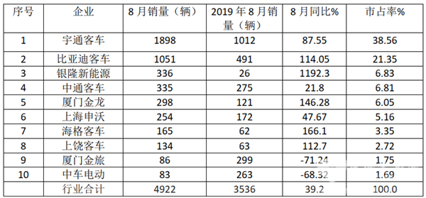 市场强势复苏,TOP10重新洗牌!2020年8月新能源客车销量特点简析