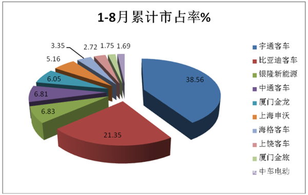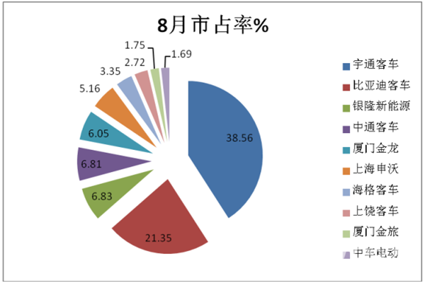 可见,按目标用途划分,8月新能源公交客车市场同比大增44.02%,且新能源公交客车占比达到94.86%,是新能源客车市场的绝对主力,因此新能源公交客车的增长成为拉动8月新能源客车整体市场增长的主力军。8月新能源公路客车市场同比增长13.96%,且占比只有5.14%,对新能源客车的增长起到了微弱的阻碍作用。