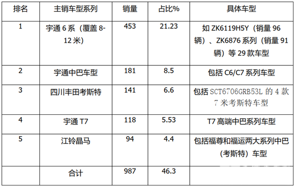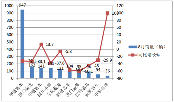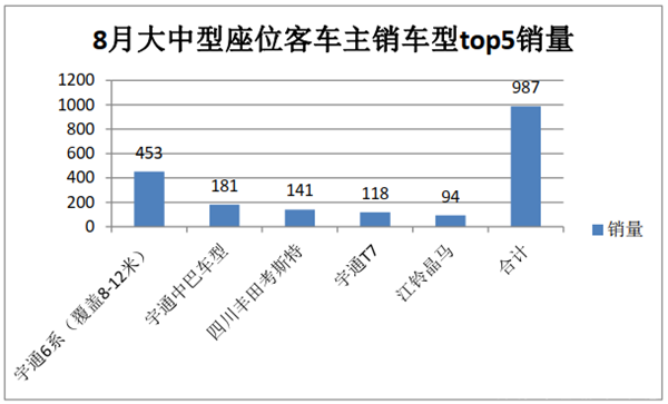 二、从8月大中型座位客车主销车型看,宇通6系车型销量最多,其次是宇通中巴车型,再次是四川丰田7米考斯特车型