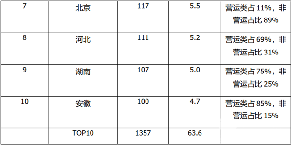 8月大中型座位客车主要流向广东、浙江、四川等区域市场;TOP10 累计占比超6成(63.6%);营运类占比最高的是湖南、四川;而非营运类(主要指团体通勤类座位客车)占比最高的是北京和上海。