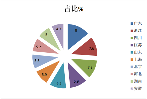 三、从8月大中型座位客车市场分布看,广东拔得头筹,浙江位居第二、四川位居第三;TOP10累计占比63.6%