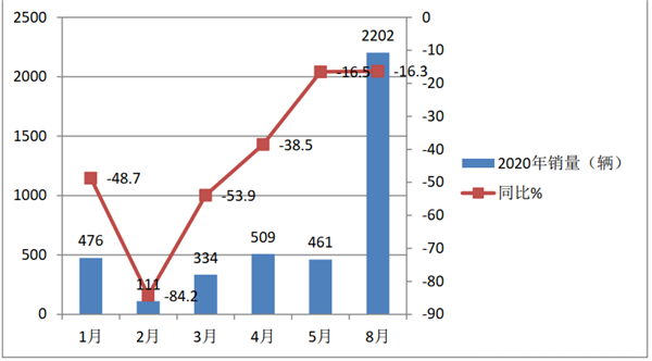 可见,在2020年8月校车销售2202辆,在2020年1-8月各月中销量最大,比处于第二高的7月份多销售1448辆,占据1-8月总销量近42%的权重,可谓“一月独大”。同时8月校车销量同比降幅为16.3%,在1-8月各月中同比降幅是最小的,因此可以说,8月是校车市场的“小阳春”,是校车市场的黄金月份,尽管同比仍然是下降的。