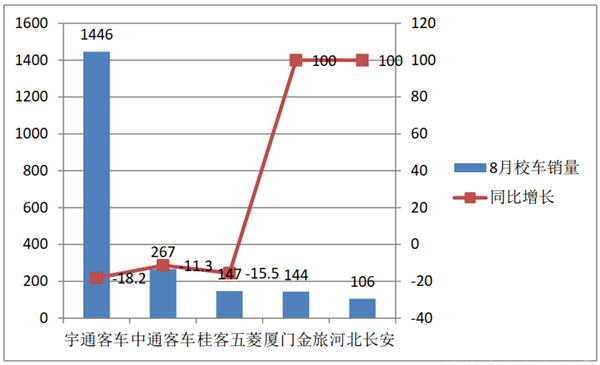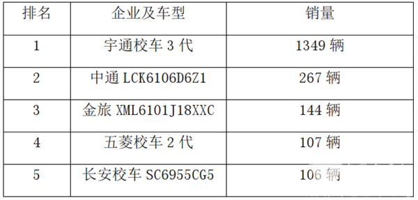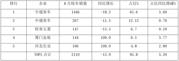 根据中国客车统计信息网数据,2020年8月校车TOP5销量排行: