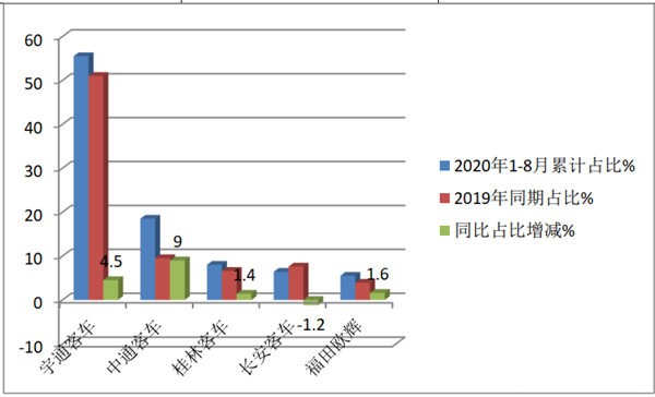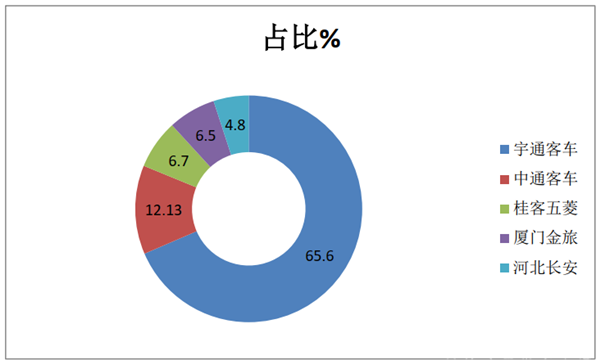 1、 宇通客车占比55.5%,且同比增加4.5个百分点,霸主地位更凸显;