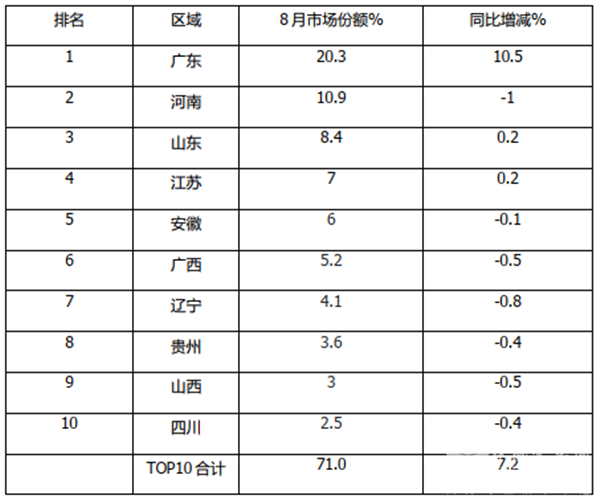 根据各地上牌信息,2020年前8月TOP10区域销量占比: