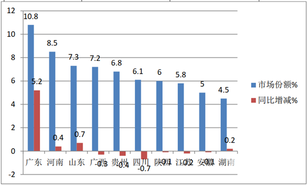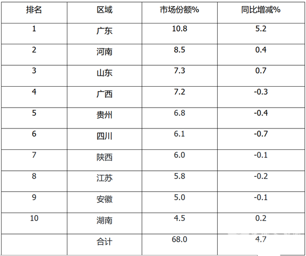 广东区域上牌数量最大;前10个区域市场累计上牌占比近7成(68%),同比增加4.7个百分点,区域市场集中度增强。