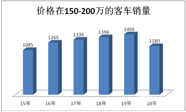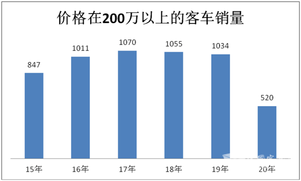 从上图表看出,价格在200万以上的高档客车细分市场,近6年的增长规律不太一样:前3年同比上升,后3年下降;2015年升幅最大,但到了2018年出现拐点,2019年延续了2018年的规律,2020年同比还是下降,且同比降幅最大。