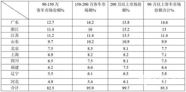 1、广东、浙江、江苏、山东、北京等TOP10市场是90万以上高档客车市场的主要需求市场,集中度比较高。需求比例占整个高档客车市场的88.3%,其他23个区域市场销售高端客车只有近12%的市场机会;