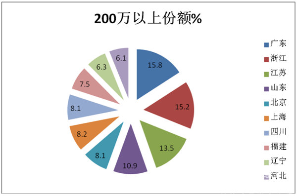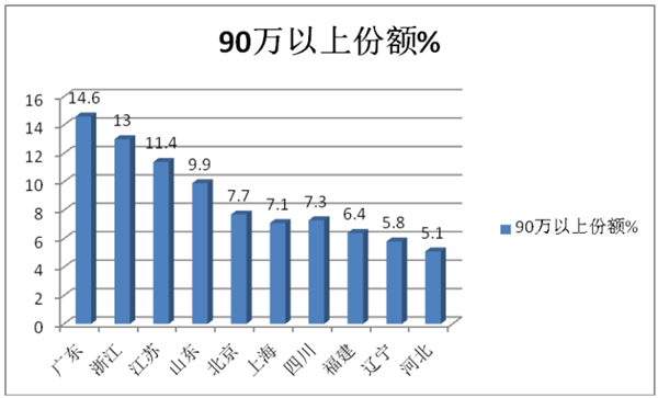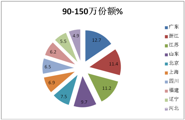 4、从价格细分市场来看,广东市场是90-150万、150-200万和200万以上价格销量最大的区域。