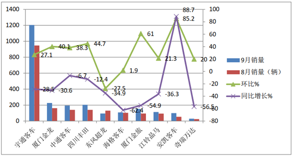 厦门金龙9月则凭借仿考四代中巴在太原和福州的批量销售,保持了前置中巴和后置座位客车较8月均有所提升。9月销量227辆,环比大增40.1%,市场占比8.65%,环比市占率增加1.05个百分点,位居行业第二,表现现对也不错;