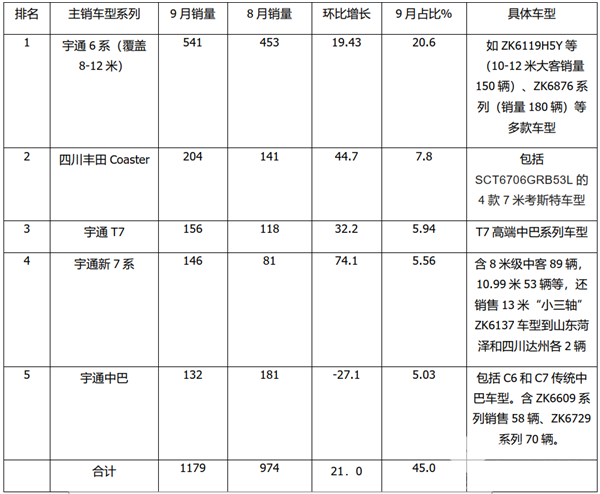 另外值得注意的是宇通新7系作为替代车型,9月实现146辆销售,环比大增超7成,意味着宇通新7新座位客车开始发力,也是9月宇通发力最为强劲的新车型。这其中包括8米系列中客销售89辆,10.99米大客销售53辆,还包括销往山东菏泽和四川达州的小三轴ZK6137车型共4辆。