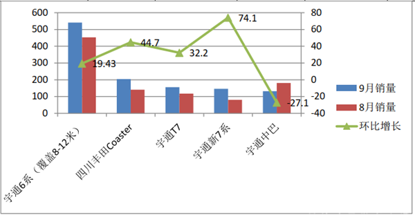 评析:总体看,9月大中型座位客车产品参与竞争的企业包括三种类型:后置大中客企业、前置中巴客车企业,以及二者相对均衡的综合性客车企业。