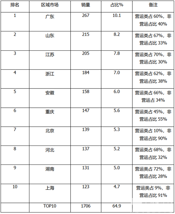 9月大中型座位客车主要流向广东、山东、江苏等区域市场;TOP10 累计占比超6成(64.9%);营运类占比最高的是湖南、江苏;而非营运类(主要指团体通勤类座位客车)占比最高的是上海、北京。