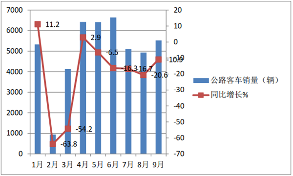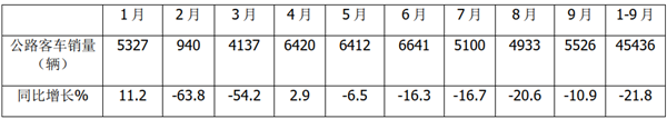 根据中国客车统计信息网数据,2020年1-9月5米以上各月公路客车销量及同比: