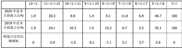 在2020年1-9月5米以上公路客车按车型长度段划分其市场结构特征: