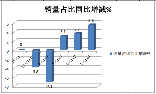 5-6米占比超4成(40.7%),为最大,11-12米占比次大(20.3%),7-8米居第三;8米以下占比均有不同程度的增加,其中5-6米占比增加最多(增加5.6%),6-7米占比增加次之(增加3.2%);8-9米占比同比减少最大(减少7.1个百分点),其次是11-12米占比减少3.8个百分点。
