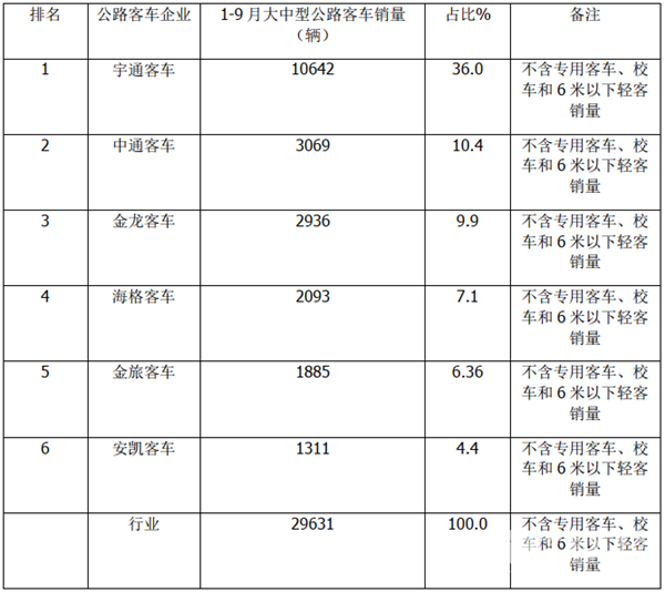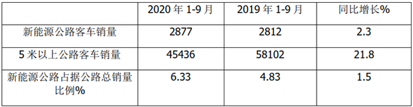 根据中国客车统计信息网数据,2020年1-9月5米以上公路客车销量及占比: