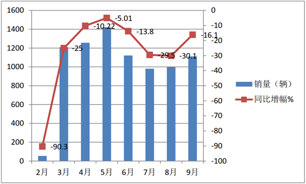 特征一、1-9月各月中,销量忽高忽低,同比演绎了罕见的“9连降”的轨迹特征,其中5月降幅最小,2月降幅最大
