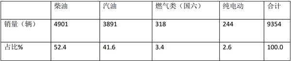 特征三、柴油占比超半壁江山,处于主导地位,其次是汽油占比超4成,纯电动占比最小