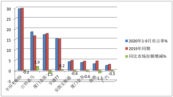 丰田柯斯达占据近3成的份额(29.7%),一家独大,毕竟其在考斯特领域的高端品牌根基已植入客户心理,但同比下降0.3个百分点,可能是因为其价格较高,有部分购买者因疫情收入下降影响了购买力放弃所致。