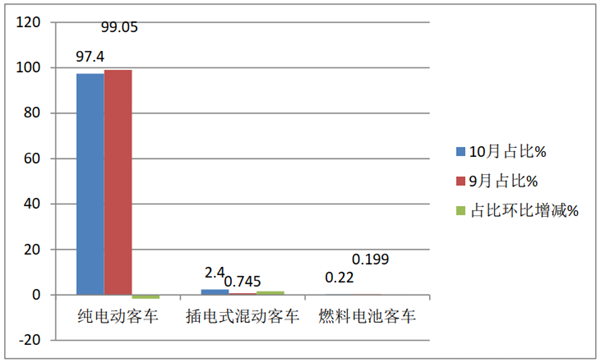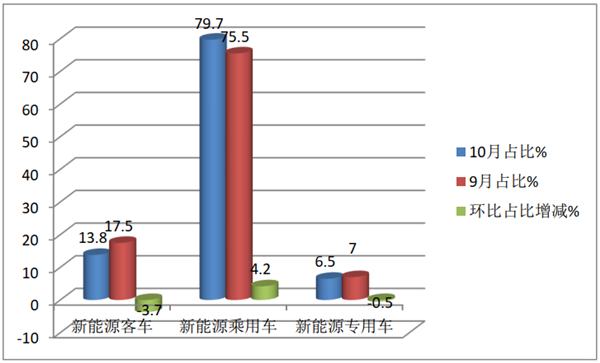 特点一、10月我国新能客车动力电池装机量在新能源汽车各细分市场中同比增幅居于第二,占比也居第二,占比环比下降3.7个百分点