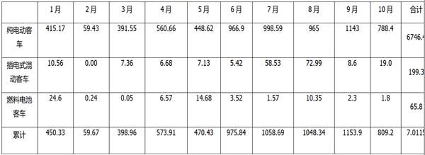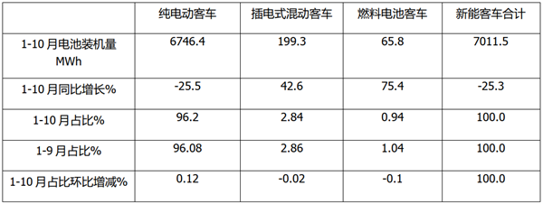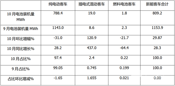 纯电动客车动力电池装机量累计6746.4MWh,在1-10月中9月处于最高;插电式混合动力客车动力电池装机量累计199.3MWh,在1-9月中8月处于最高;燃料电池客车动力电池装机量累计65.8MWh,在1-9月中1月处最高;10月新能源客车总装机量在前10月中处于第4高,最高的是7月,其次是9月,再次是8月。