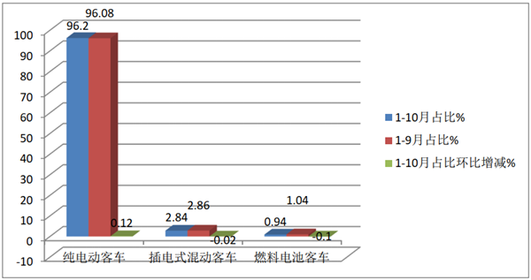 2020年1-10月,按技术路线划分,在新能源客车中,纯电动客车动力电池装电池机量占据超96.2%,其主体地位比1-9月更为突出(1-9月占比为96.08%),其销量同比下降25.3%;插电式混合动力客车装机量位居第二,占比2.84%,比1-9月(占比2.86%)减少0.02个百分点,但其销量同比增长42.6%;燃料电池客车电池装机量最小,占比只有0.94%,比1-9月减少0.1个百分点(1-9月占比为1.04%),但其销量同比增幅达到75.4%,说明1-10月燃料电池客车电池装机量市场同比增幅在新能源客车中为最大,其次为插电式混动客车,纯电动客车装机量累计同比是下降的。