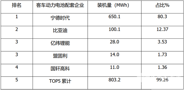 在2020年10月新能源客车动力电池配套企业中,宁德时代一家独大,配套的装机量占比80.3%,其次是比亚迪,占比12.37%,再次是亿纬锂能,占比3.53%,TOP5累计占比99.26%,几乎垄断了整个新能源客车行业,其他电池配套企业生存空间非常狭小!