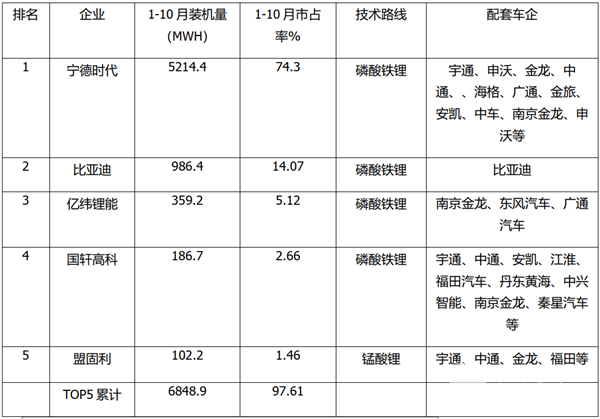 在2020年1-10月新能源客车动力电池配套企业中,宁德时代霸主地位明显,配套的装机量占比74.3%,其次是比亚迪,占比14.07%,再次是亿纬锂能,占比5.12%,TOP5累计占比97.6%,垄断程度比1-9月进一步提高,但几乎垄断了新能源客车行业。