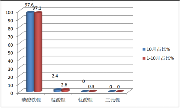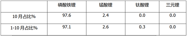 可见,不管是10月还是1-10月,在新能源客车动力电池装机量中,磷酸铁锂电池占比均是一家独大,占据绝对主体地位,主要是磷酸铁锂电池的良好的热稳定性和安全性能更适合载人的客车所致。