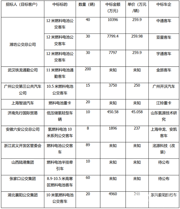 2020年前10月,我国燃料电池汽车(主要是客车)主要批量订单统计如下表: