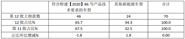 上表可见,在2020年第12批新能源客车推荐目录中,符合财建符合财建【2020】86号产品技术要求的车型占65.7%,为此次新能源客车推荐目录上榜车型中的主体,环比下降1.8%;其他占比34.3%,环比上升1.8%。